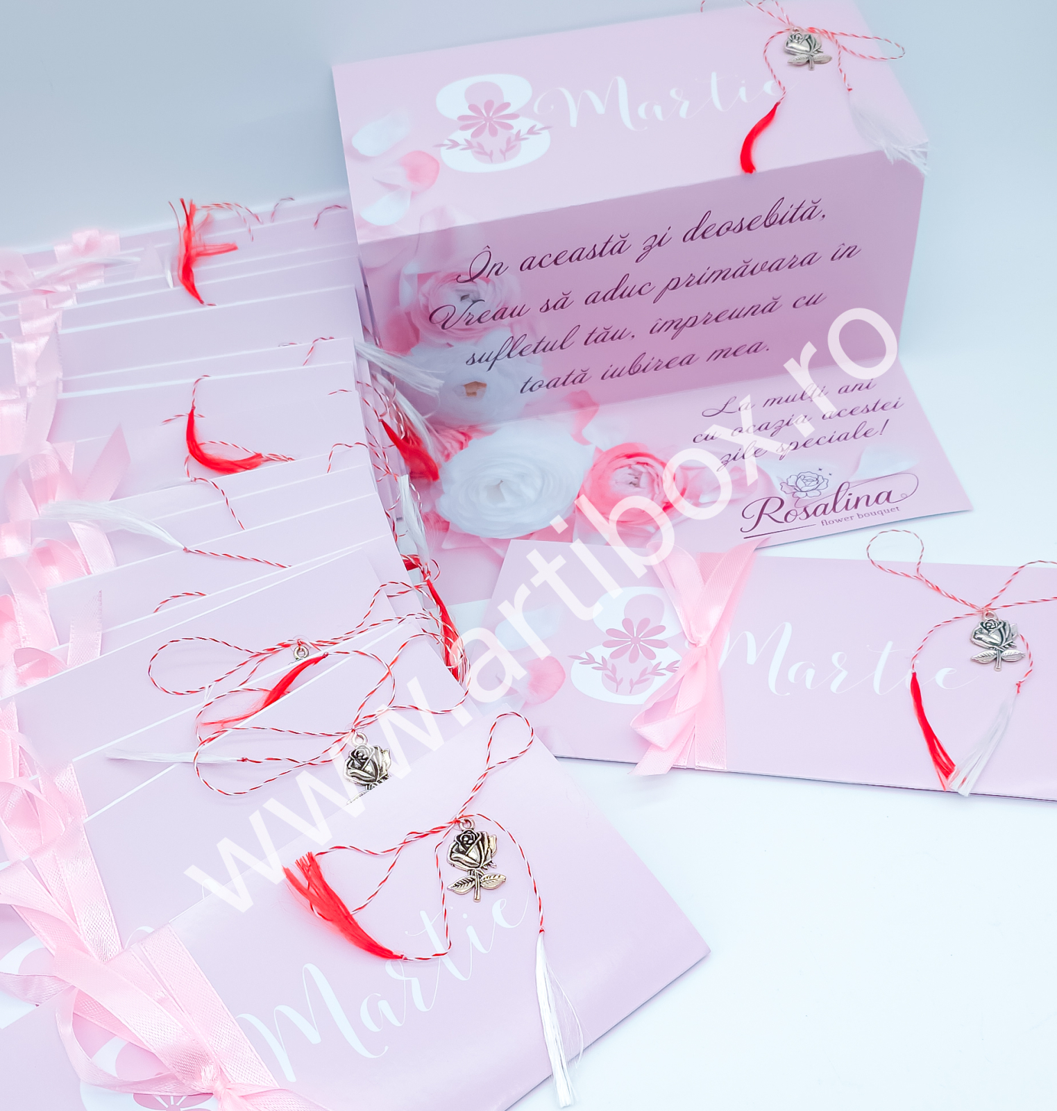 Martisor cu felicitare model unicat cu trandafiri, charm argintiu si snur alb-rosu