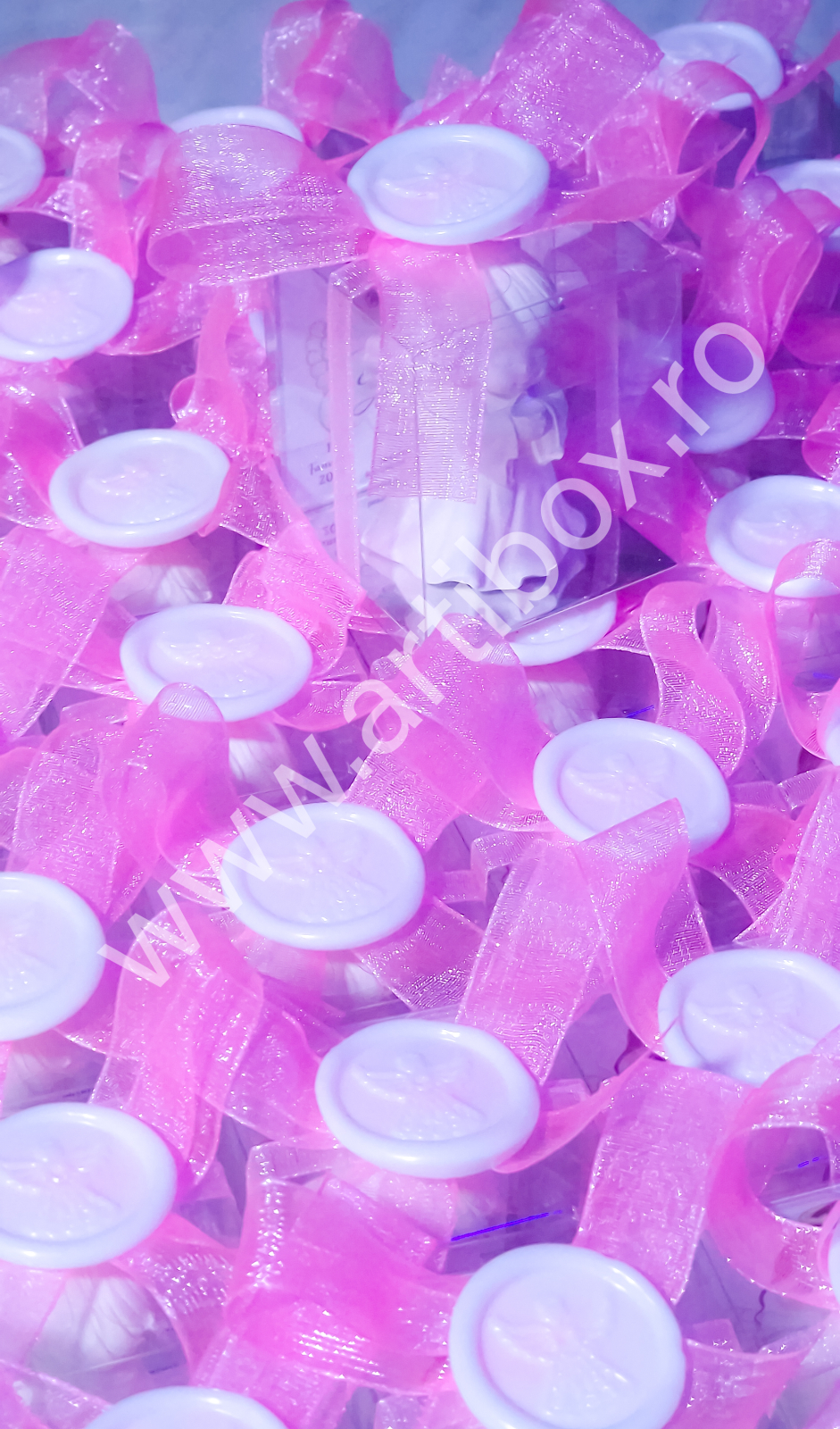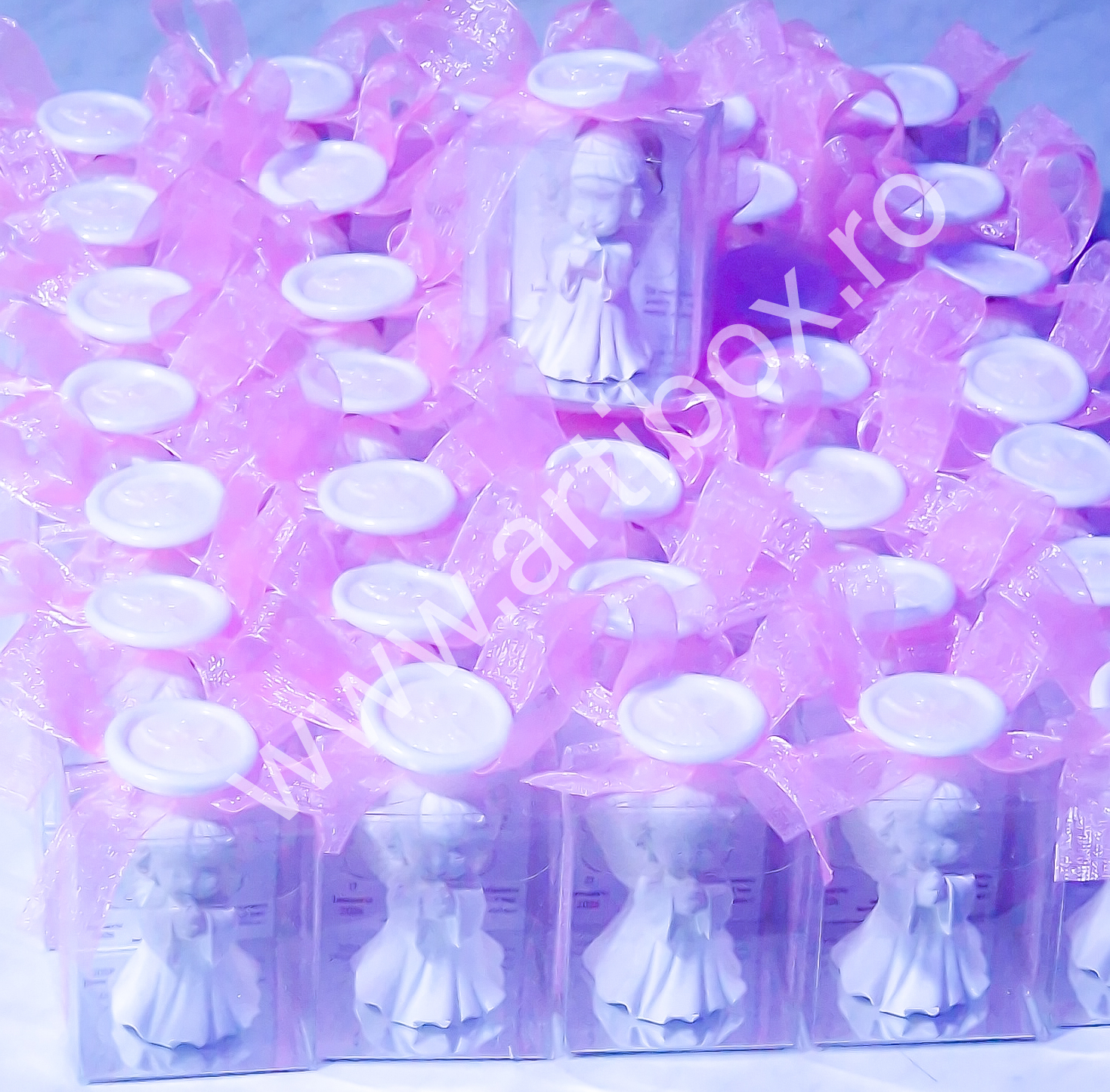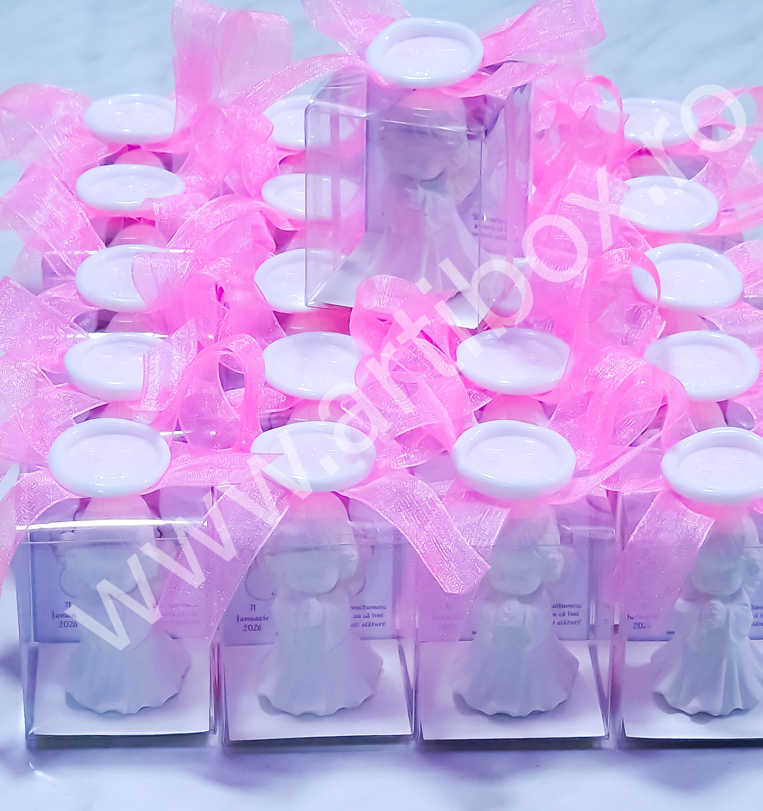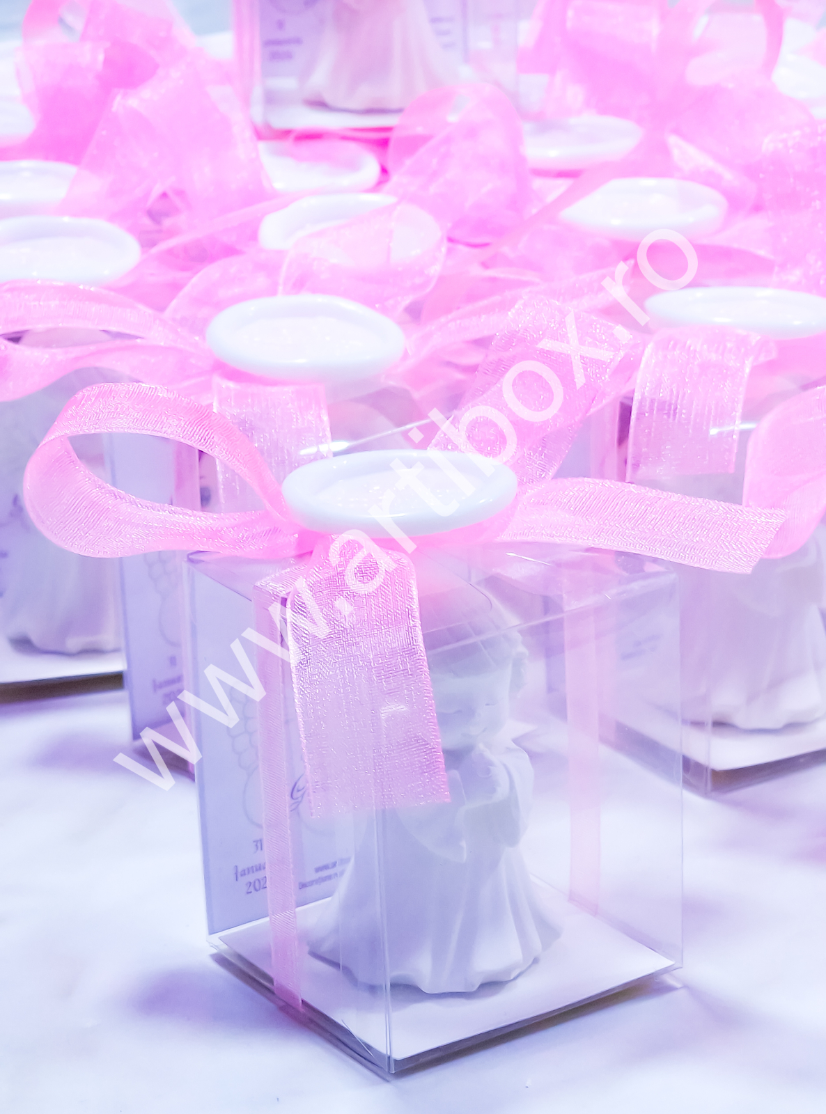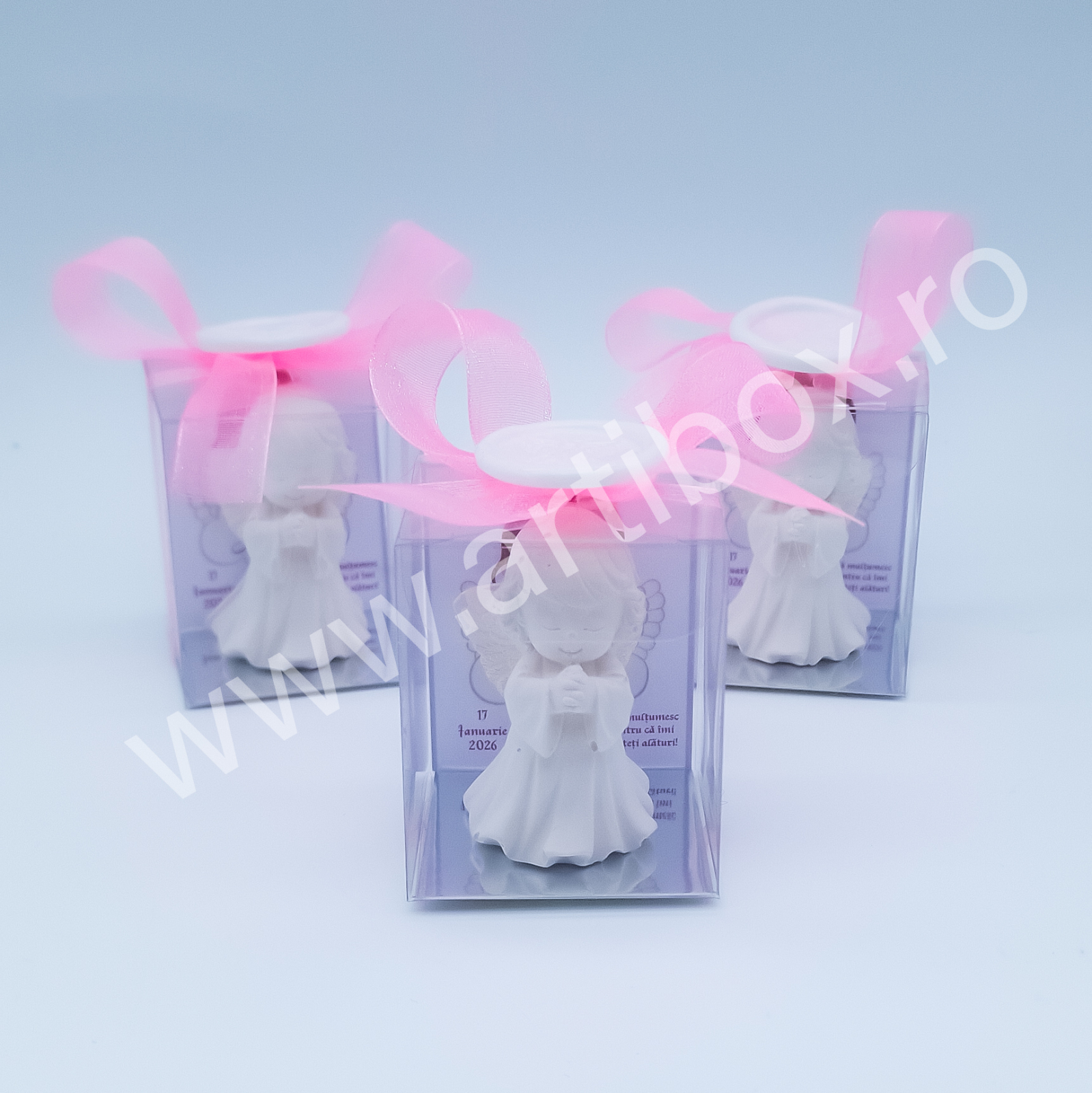 Figurina ingeras este pusa intr-o cutiuta din acetofan, cartonas personalizat, ornata cu panglica din organza si sigiliu cu ingeras din plastic. Sigiliul este turnat si realizat in atelierul nostru.