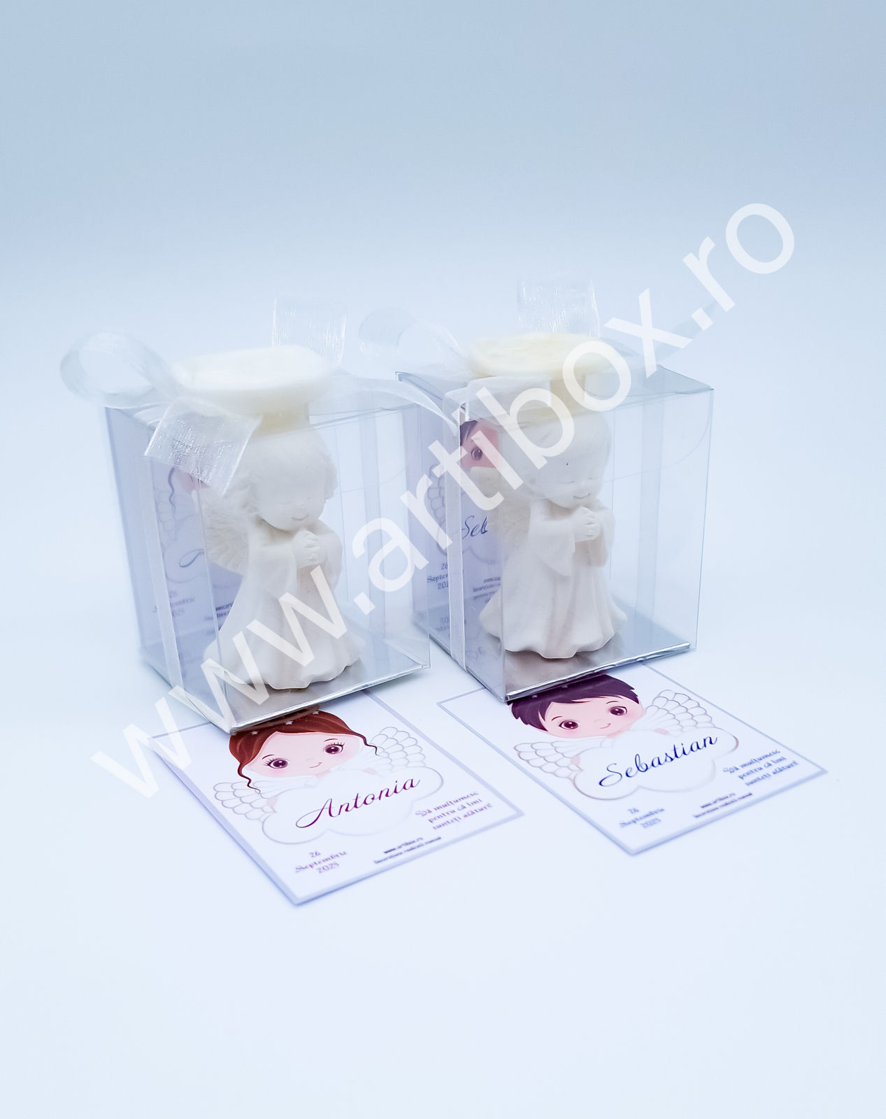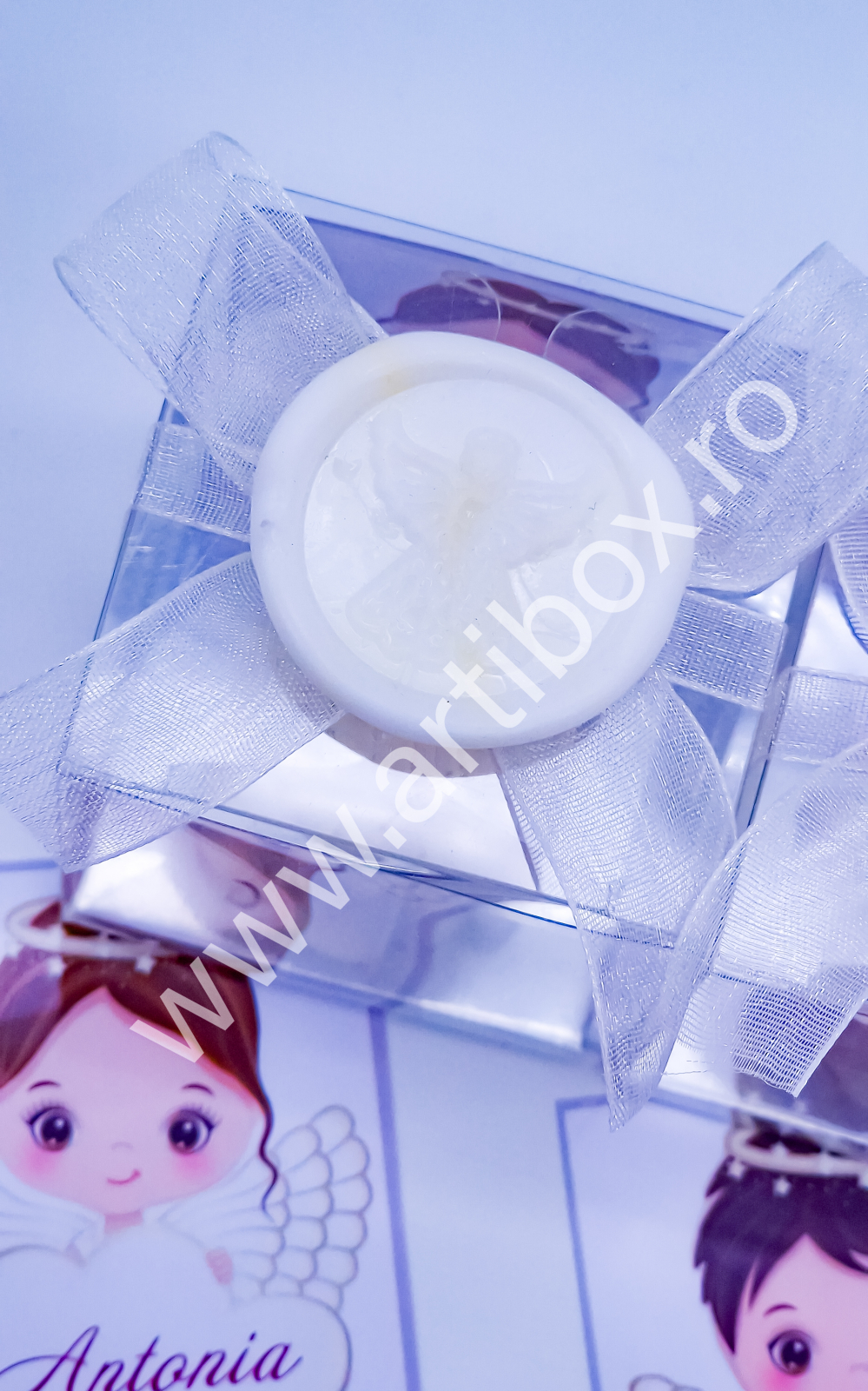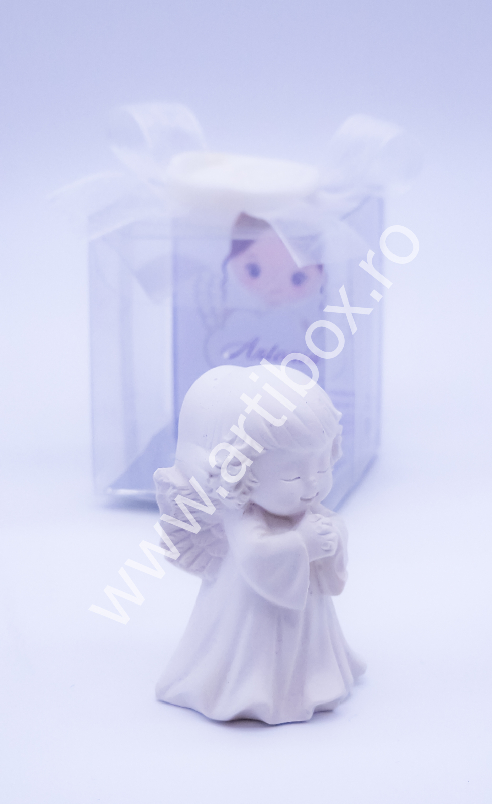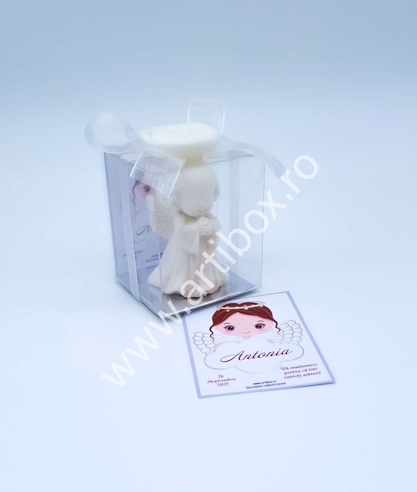 Figurina ingeras este pusa intr-o cutiuta din acetofan, cartonas personalizat, ornata cu panglica din organza si sigiliu cu ingeras din plastic. Sigiliul este turnat si realizat in atelierul nostru.